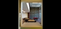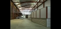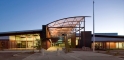 The steel-framed structure is mostly clad in masonry and steel panels. It features a partial barreled ceiling through the center of the building with sloping roofs from the apex.